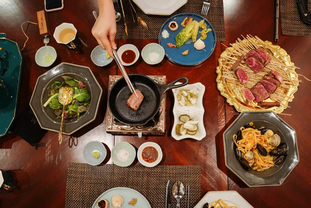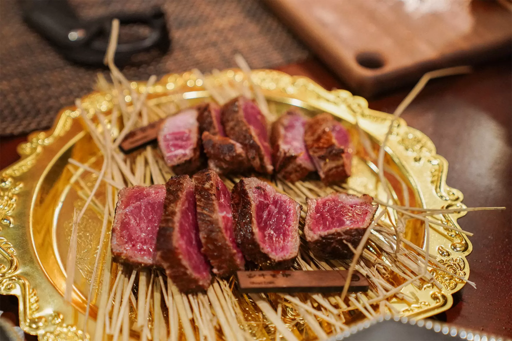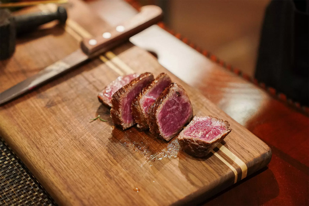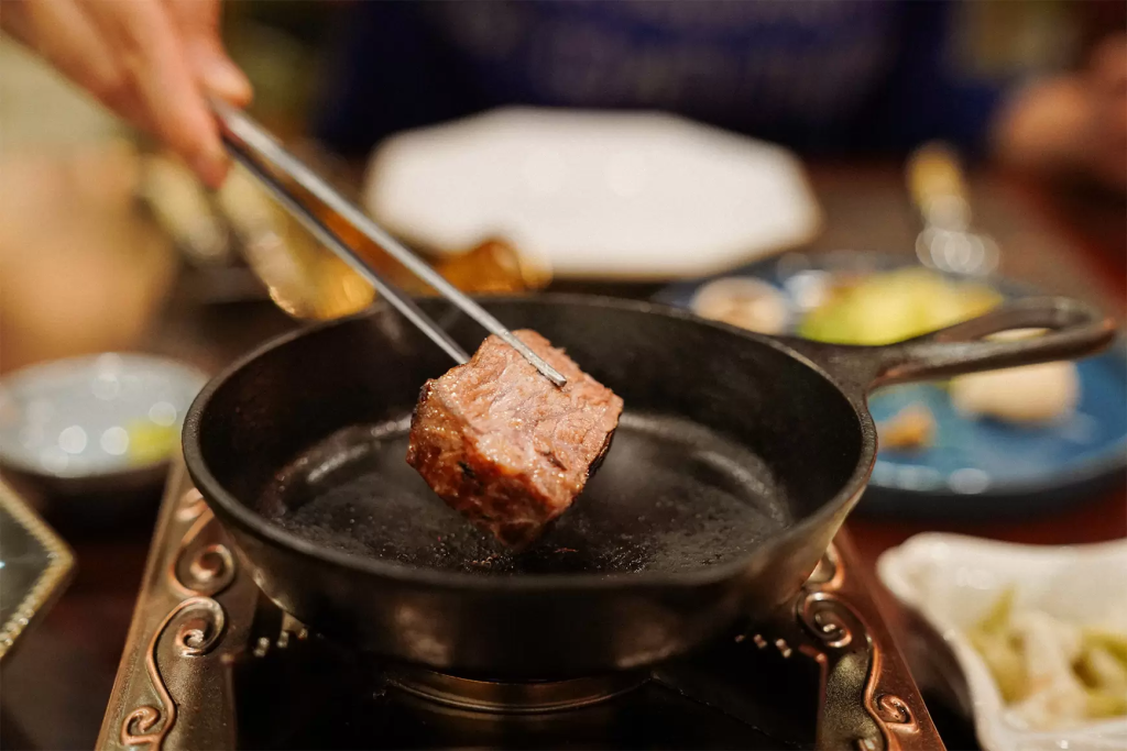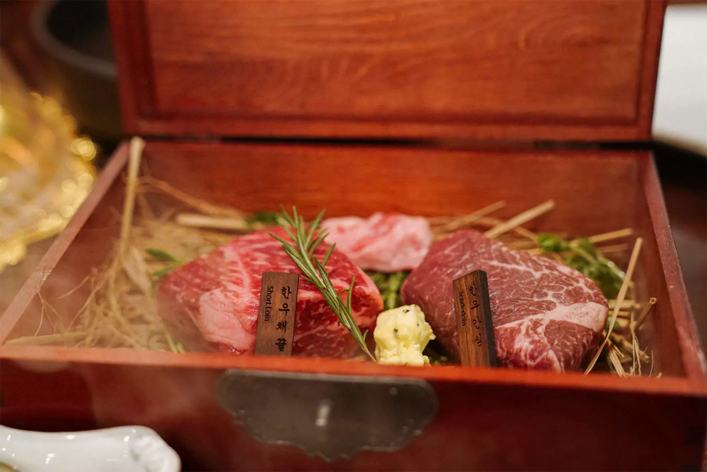 공간의 콘셉트만큼이나 메뉴들도 심상치 않게 등장했습니다. 스테이크는 나무 상자에 담겨 나왔고, 그 옆에는 규카츠 가게에서만 보던 개인 화로가 마련되어 있습니다.