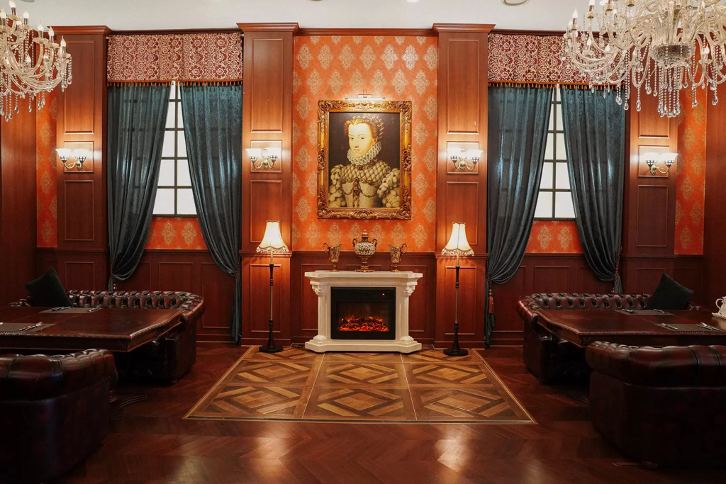 입구에 가까이 다가가자 스르륵 자동문이 열렸습니다. 문틈 사이로 조금씩 실체를 드러내는 내부 모습에 입이 떡 벌어졌어요. 마치 19세기 서양의 귀족 가문의 저택을 연상시키는 인테리어, 반짝이는 샹들리에, 널찍한 가죽 소파까지. 외관에 잠시 속았지만 이곳은 분위기 맛집이었습니다. 갑자기 펼쳐진 럭셔리한 분위기는 마치 꿈속에 있는 듯한 착각이 들 만큼 예뻤어요.