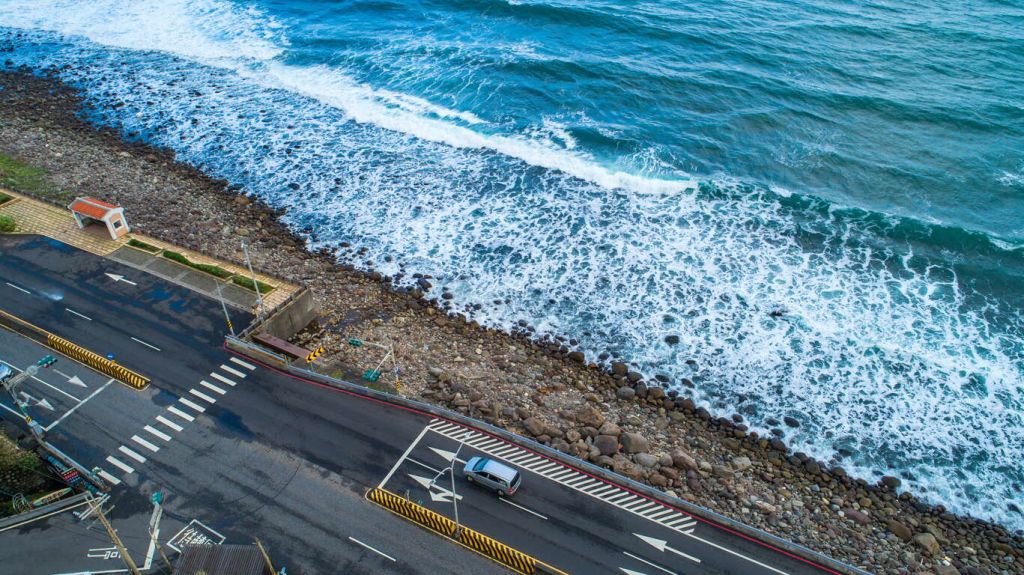 독특한 암석 지형이 인상적인 탸오스 해안. 진산구 서쪽 해안을 따라 펼쳐지는 이 해변은 아직 여행객에게 덜 알려진 현지인 감성 포토 스팟이다. 바이샤완 해변이나 중자오완 해변과 달리 주변에 카페나 식당이 없는 편이라 오히려 한적한 여유를 즐기기 좋다.