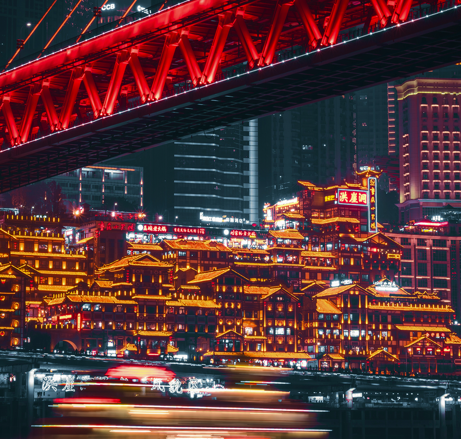 충칭은 산과 강이 어우러진 험준한 지형 덕분에 독특한 계단식 도심 풍경이 인상적인 도시다. 그중에서도 기슭 절벽을 따라 층층이 지어진 전통 목조 건물인 홍야동은 밤이 되면 화려한 조명이 더해져 애니메이션 속에 들어온 것 같은 분위기를 자아낸다.