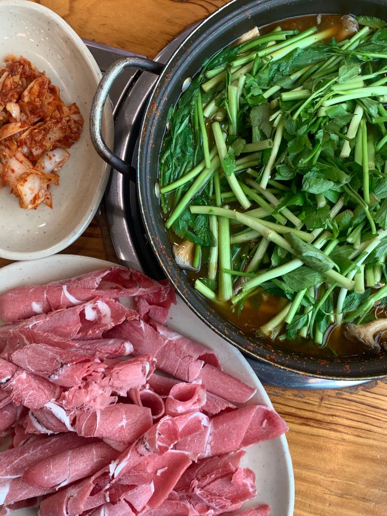 미나리를 좋아하는 사람들이라면 놓쳐선 안 될 맛집. 직영 농장에서 재배한 미나리를 샤브샤브에 가득 넣어 준다. 주 메뉴인 손칼국수는 취향에 따라 빨간 맛과 하얀 맛 중에 골라서 먹을 수 있다. 칼국수를 먹은 뒤 먹는 볶음밥에도 미나리를 넣어 주기 때문에, 아쉬움 없이 미나리의 향긋함을 즐길 수 있다.