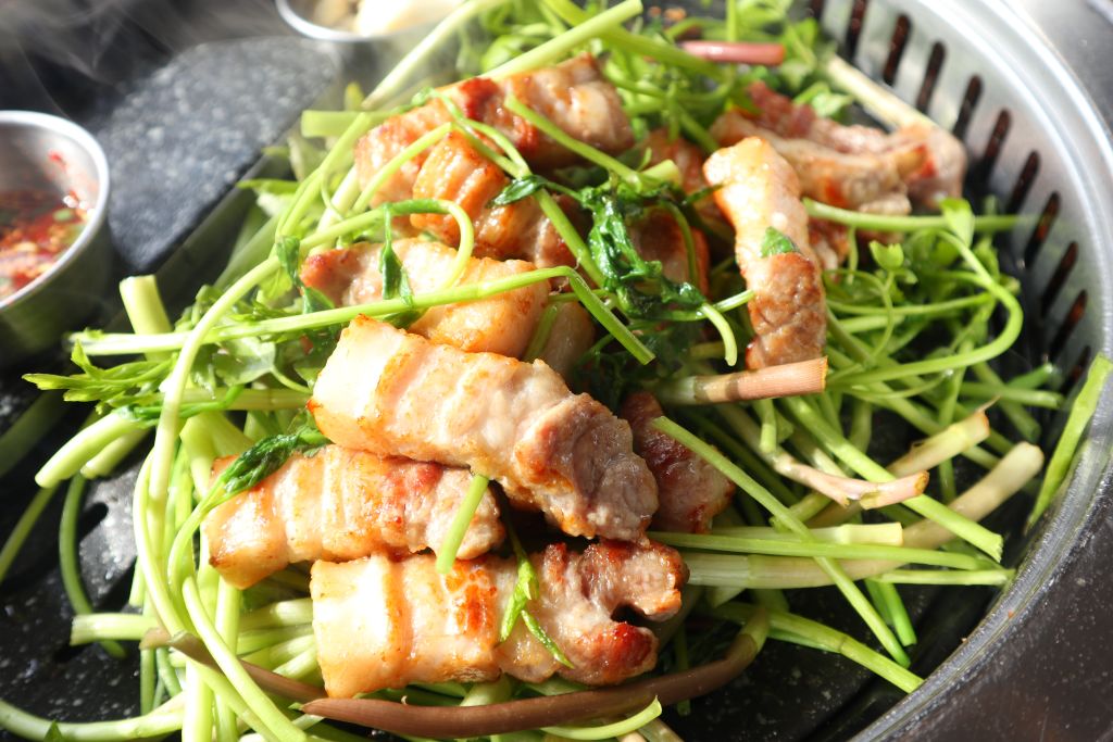 삼겹살과 미나리를 함께 구워 먹는