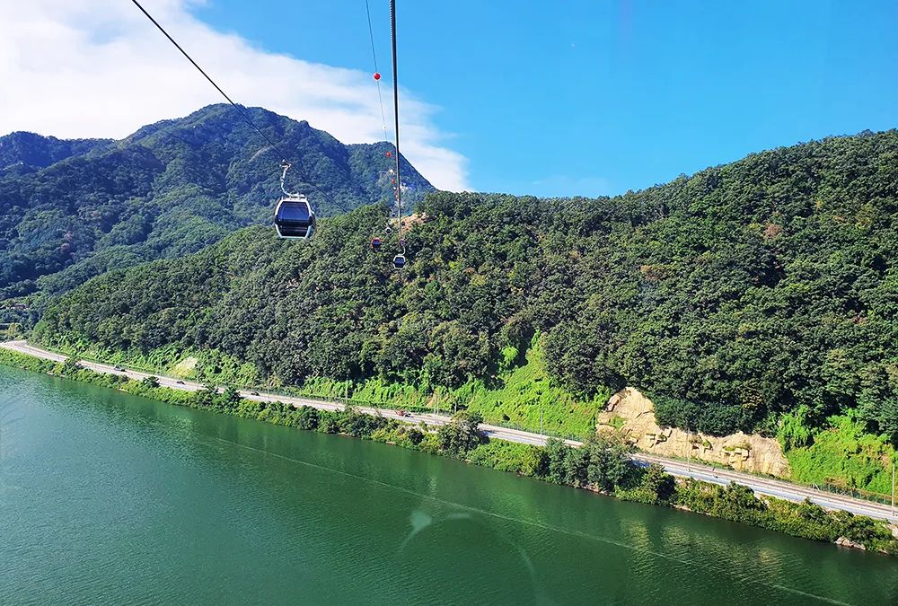 의암호 위를 가로지르는 케이블카. 전체가 통유리로 되어 있어 초록빛 풍경을 감상하기 좋다.