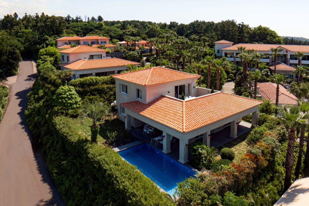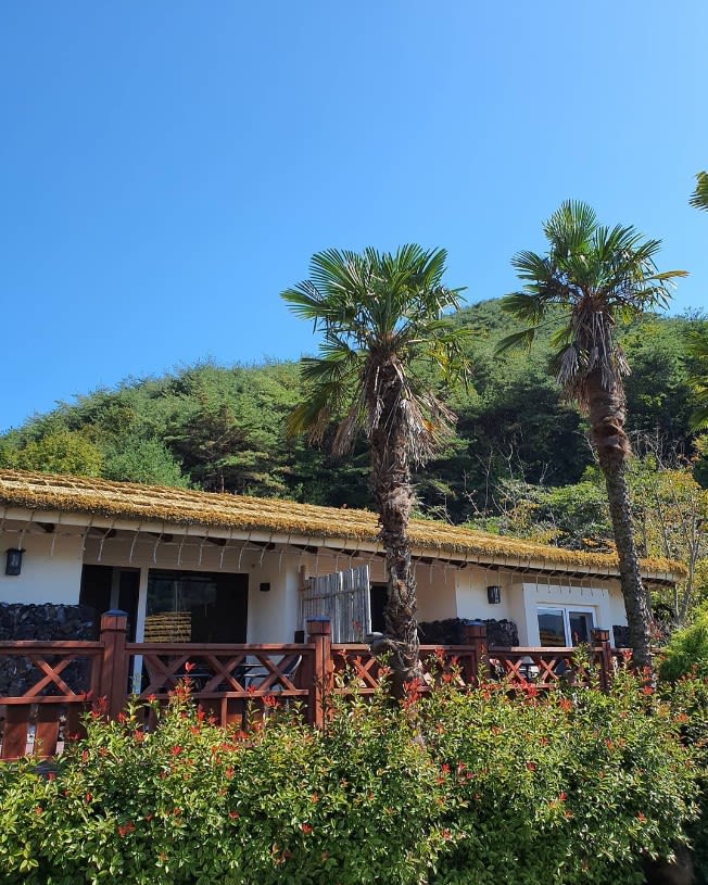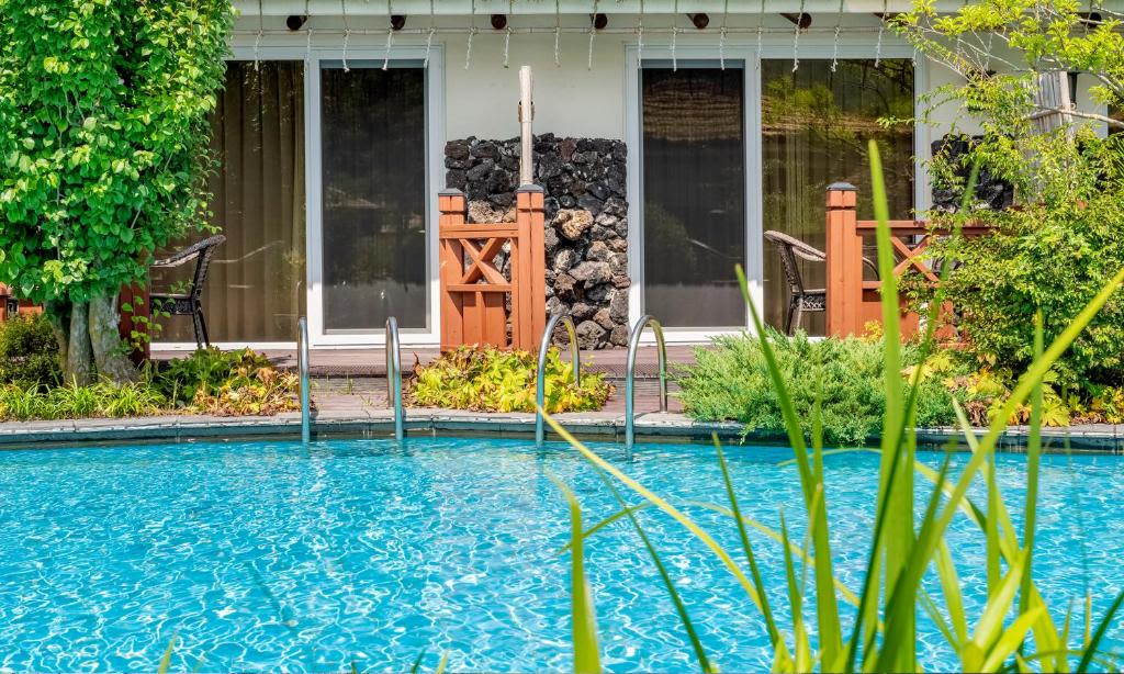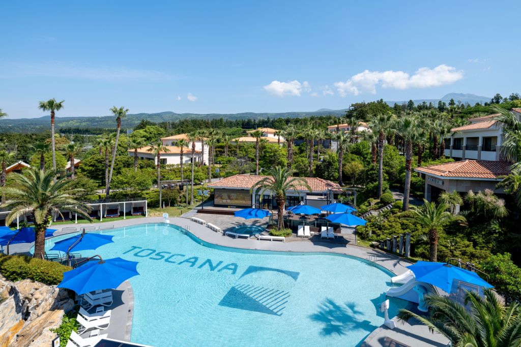 동남아 휴양지에 온 듯 이국적인 풍경이 사진을 부르는 리조트. 객실들 가운데 자리한 파란 야외 수영장을 바라보고 있으면 한국임이 믿기지 않을 정도다.