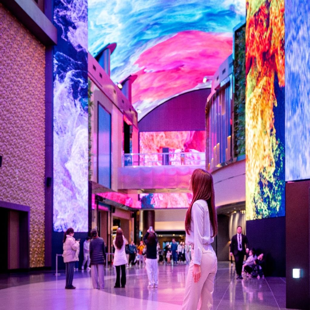 하이라이트는 천장과 벽면에 설치된 몰입형 미디어아트! 바다, 오로라 등 각양각색 작품들을 감상하며 신비로운 인생샷을 남길 수 있다.