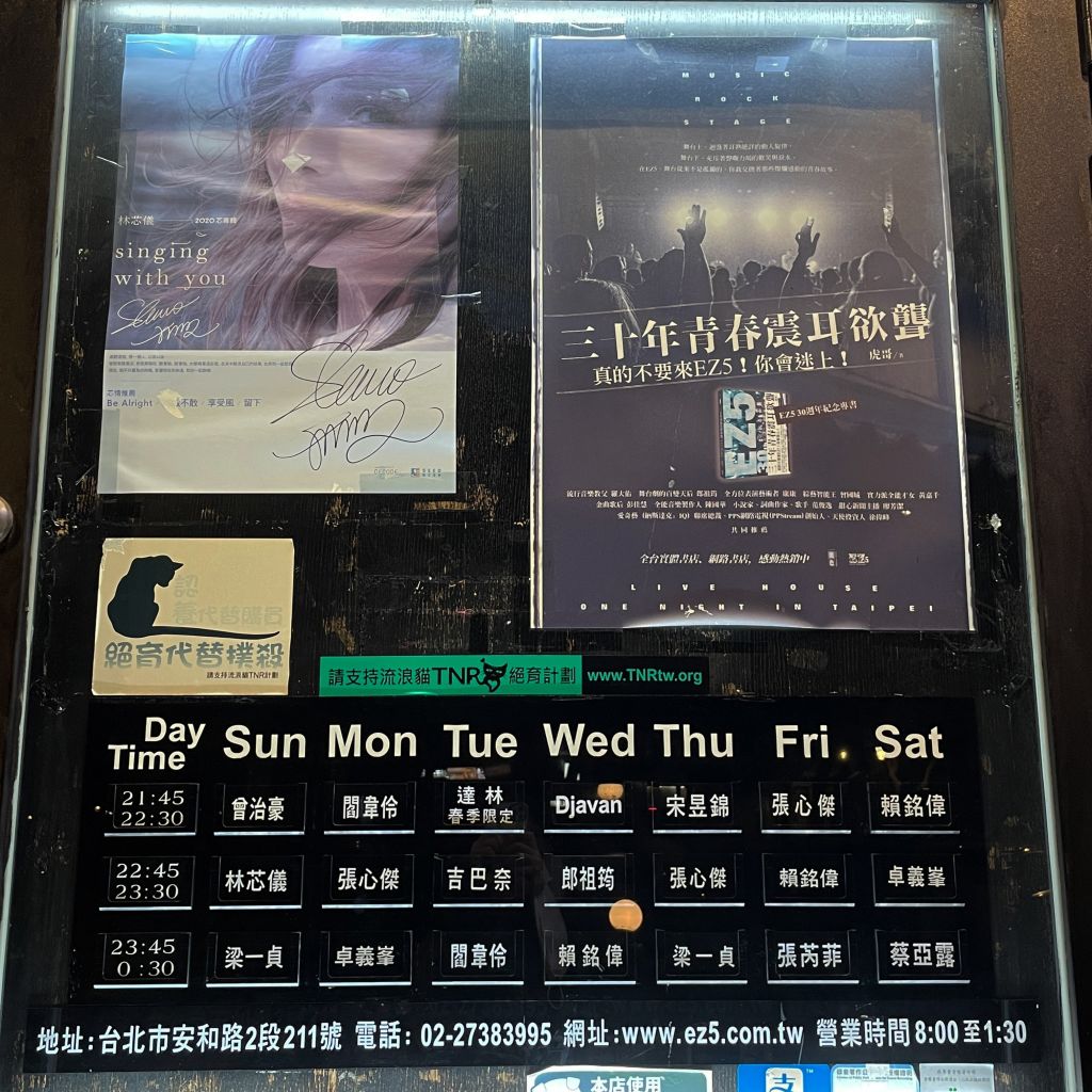 타이베이에서의 밤을 더 즐겁게 해줄 라이브 공연도 놓칠 수 없다. Ez5 라이브 하우스는 수준 높은 공연은 물론 다채로운 안주를 제공한다. (평일 입장권 800 타이완 달러) 언더그라운드에서 활동 중인 뮤지션들의 다채로운 공연이 펼쳐지는 리버사이드 뮤직 카페도 추천.