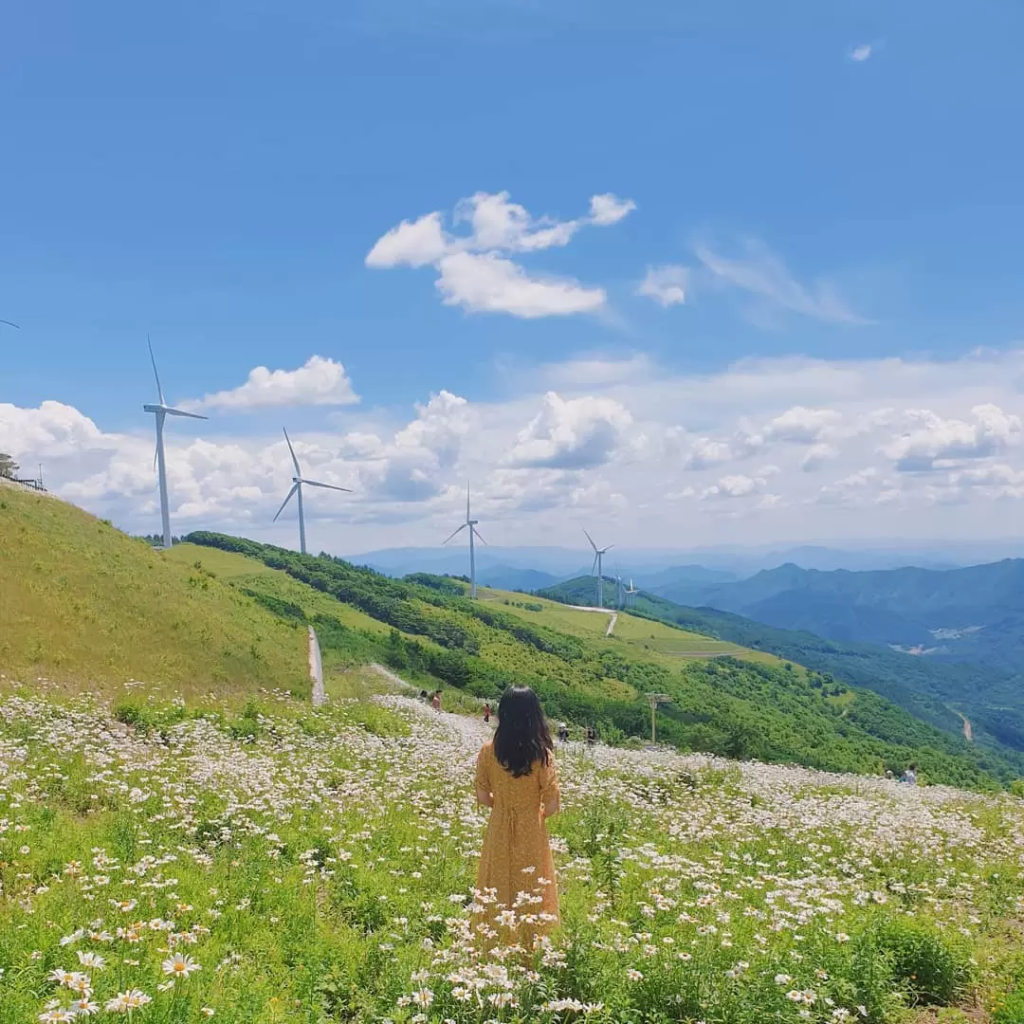 산을 오르는 동안 북유럽을 연상케 하는 하얀 자작나무 숲을 만날 수 있어요. 한국의 알프스로 불리는 곳답게 봄철에는 산 능선에 가득 핀 데이지 꽃이 마치 눈 내린 듯한 장관을 만들어내죠.