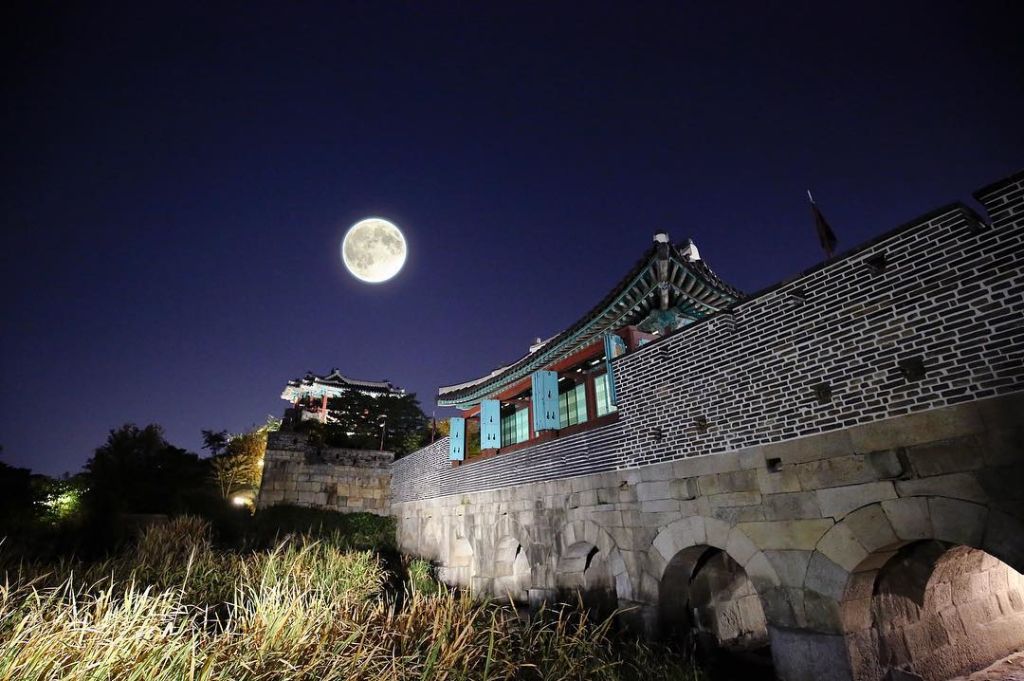 - 수원 화성시간 여행을 떠난 듯한 느낌을 선물하는 명소. 전통적인 건축물 위로 뜬 보름달을 볼 수 있다. 남서쪽에 우뚝 솟은 서장대가 달맞이 포인트며 수원의 야경은 덤이다.