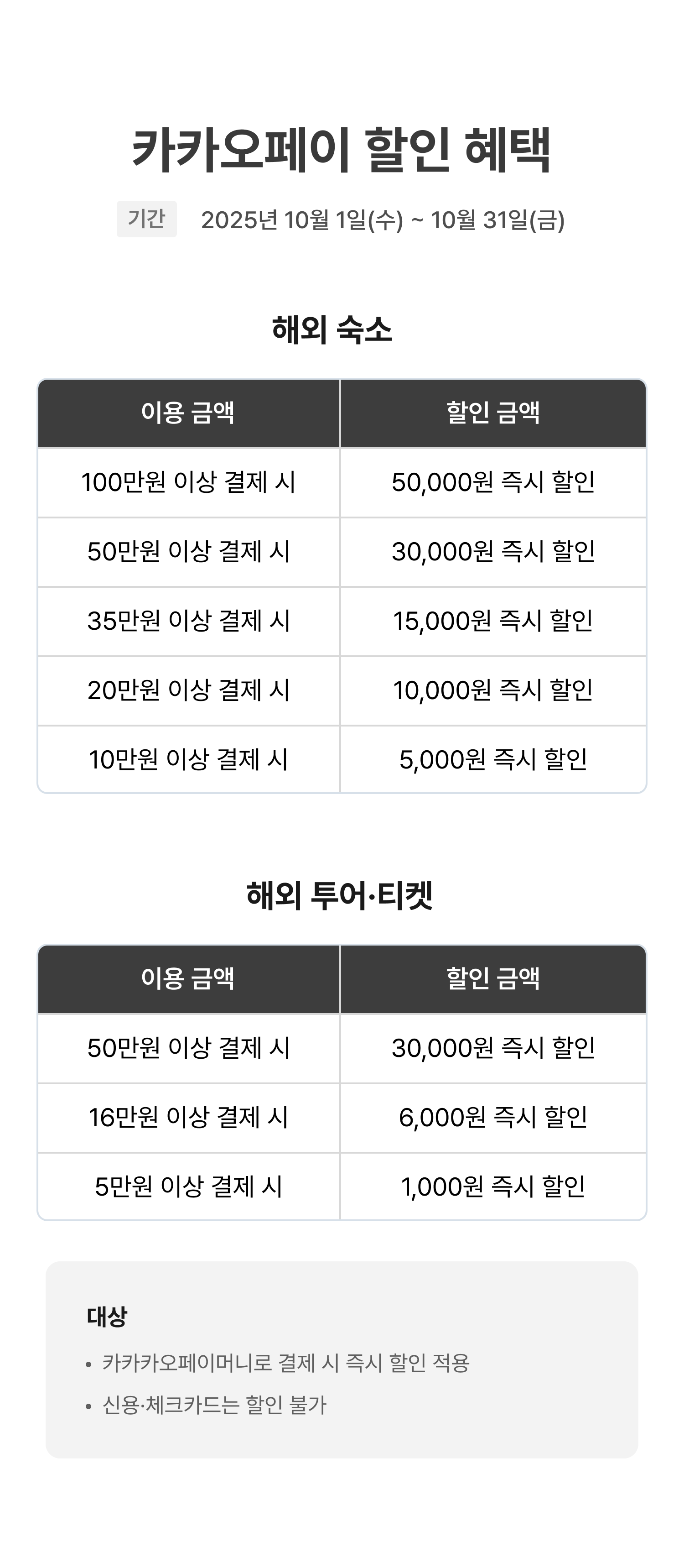 ・ 기간 내 1인당 (카카오페이 서비스 가입 기준) 1회 할인 적용할 수 있습니다.