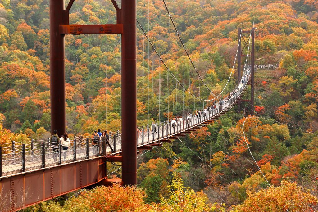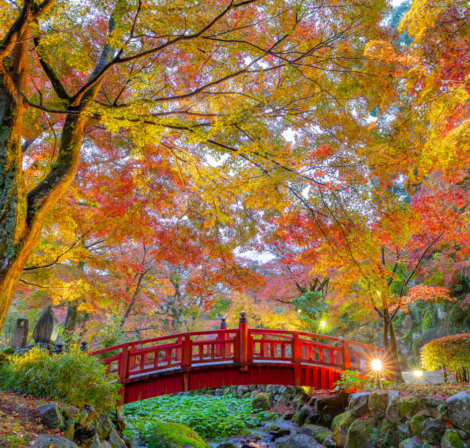 단풍놀이와 온천욕, 모두 즐길 수 있는 마을. 단풍나무숲, 온천 거리, 사찰 등 곳곳에 단풍 스팟이 있다. 11월 말이면 ‘니지노 사토’에서는 단풍 라이트 업이 열린다.