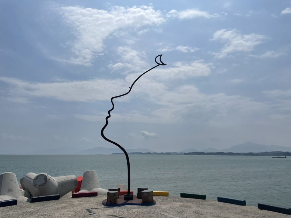 항구 끝에 자리 잡은 얼굴 조형물과 사진 찍기 좋은 곳