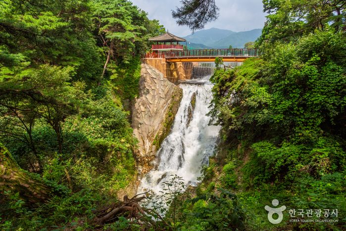 시원하게 쏟아지는 폭포를 감상하기 좋은 이색 유리 전망대
