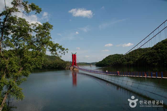 호수의 풍경을 보며 걸을 수 있는 아찔한 출렁다리가 인기인 관광 명소