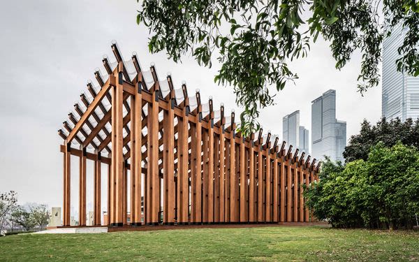 독특한 목조 구조물을 배경으로 사진을 찍거나 편하게 쉬어가기 좋은 공간
