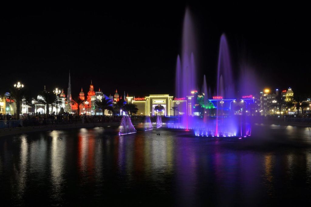 화려한 조명 아래에서 분수 쇼를 관람할 수 있는, 테마파크 내 대형 분수대