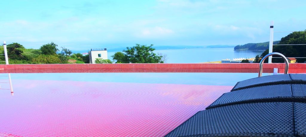 시선을 사로잡는 붉은 수영장과 인피니티 풀이 있는 캠핑장