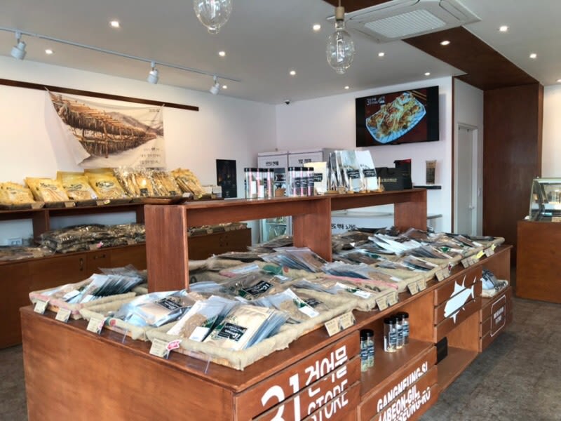 다양한 종류의 건어물을 판매하는, 세련되고 깔끔한 인테리어의 상점
