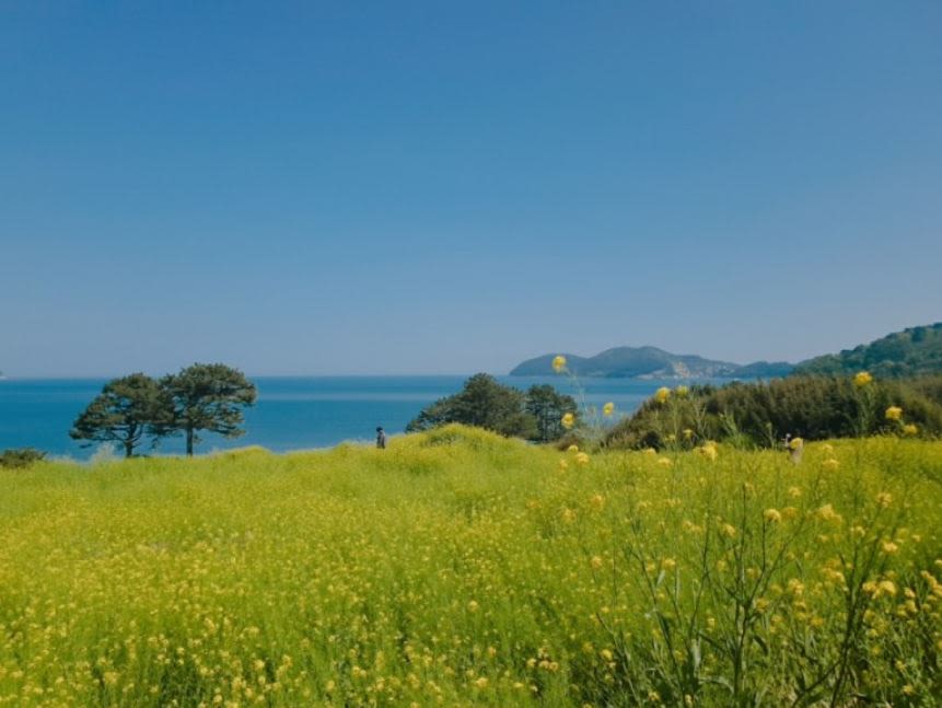 푸른 남해와 노란 물결의 조화가 장관을 이루는 유채꽃 군락지