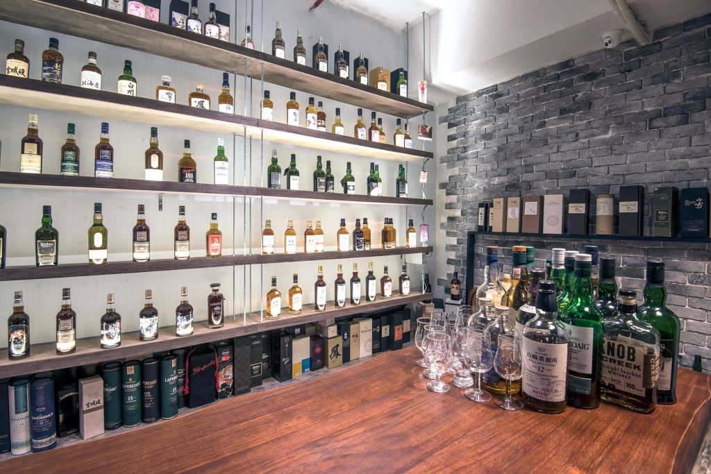 원목 탁자 위에 수십 가지의 위스키를 진열한, 신비로운 분위기의 숍