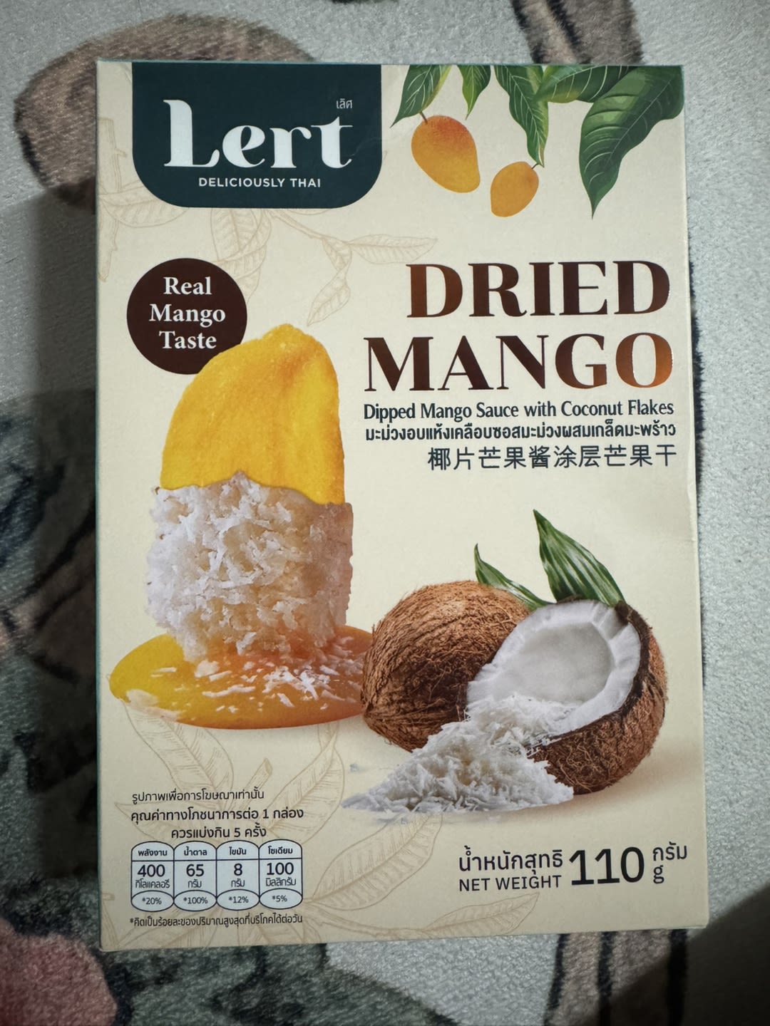 바로바로 망고 lert 코코넛맛.. 선물로 돌리고 한박스 남아서 먹어봤는데... 왜 이것만 사왔을까요...!!! 조금 비싸긴하지만 너무 너무 맛있네요..ㅠ 태국 가서 다른거 사지 마시고 이 제품 꼭 사오세요. 더 구하고 싶어서 쿠퐝 뒤져봐도 없네요ㅠ 너무 슬픔.. 건망고는 다른거 사지마시고 이걸로.. 회사 사람들도 이 건망고 먹고 감탄만 했습니다ㅠ 한국에 왜 안팔죠??????하ㅠ