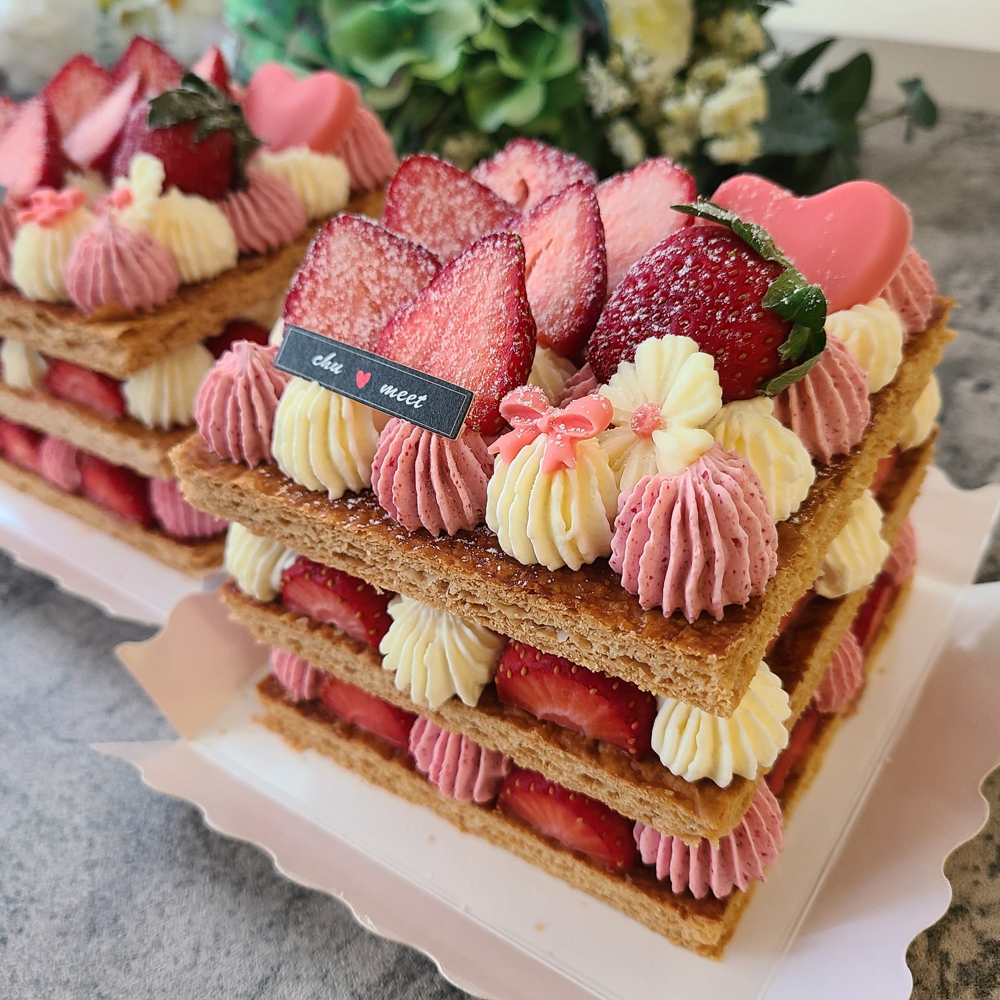 페이스트리 사이에 커스터드 크림과 딸기를 넣은 디저트