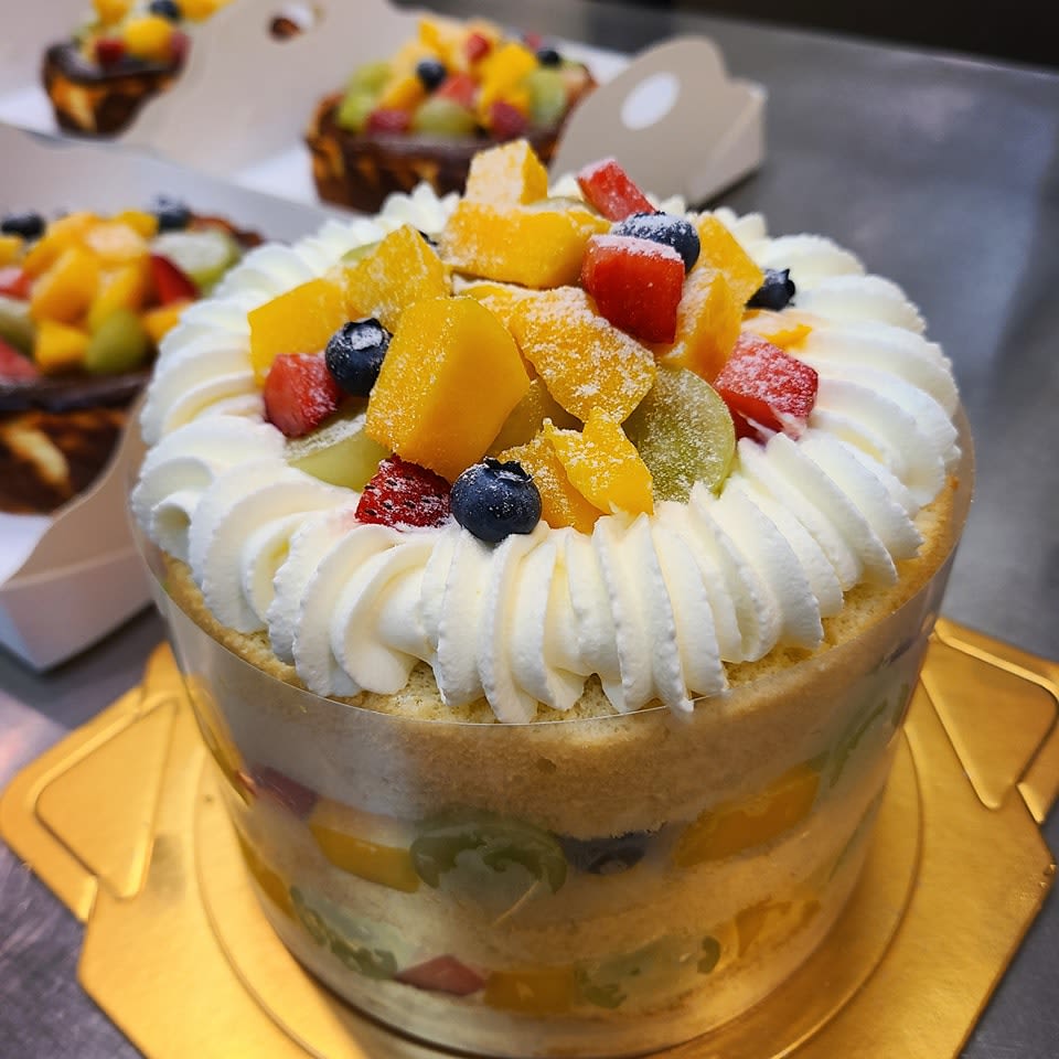 쉬폰 케이크 시트 사이에 종합 과일과 딸기잼, 생크림 등을 넣은 디저트