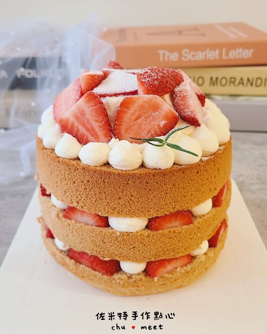 쉬폰 케이크 시트 사이에 생크림과 딸기를 가득 넣은 케이크