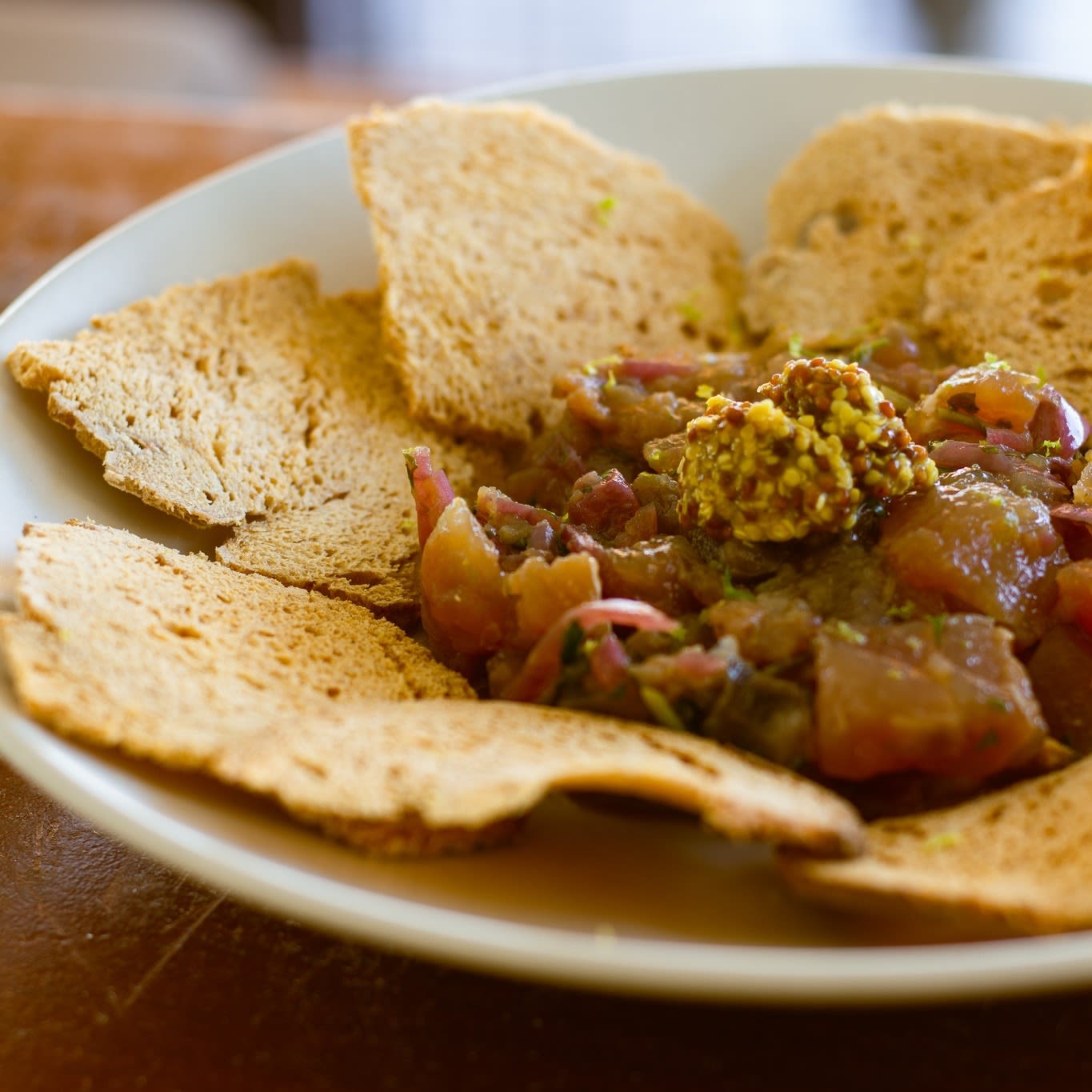 깍둑 썰기한 참치에 양념, 사워도우를 곁들인 메뉴