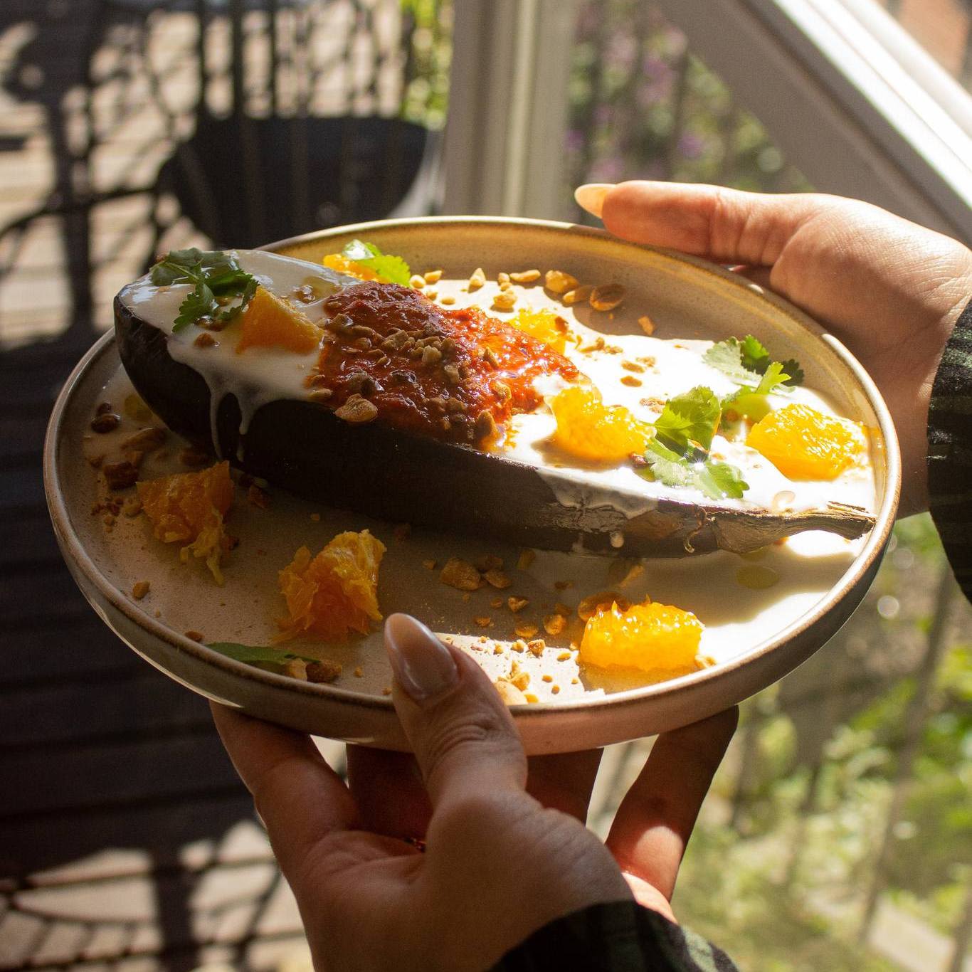 가지에 요거트, 매운 양념, 오렌지 등을 곁들인 메뉴