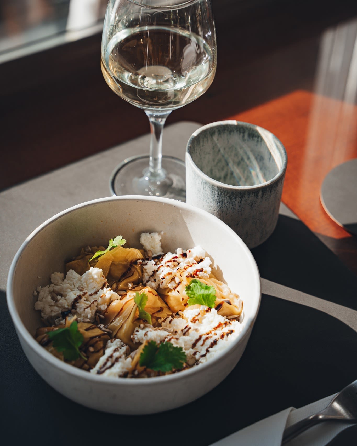 호박, 밤을 넣은 만두에 크림 치즈를 곁들인 메뉴