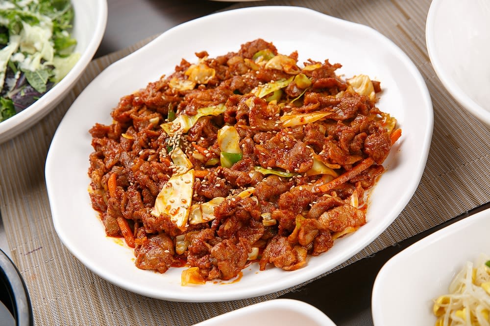 얇게 썰어낸 돼지고기에 채소와 매콤한 소스를 넣고 볶아낸 메뉴