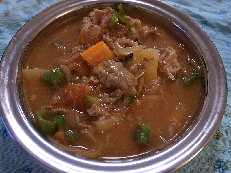 돼지고기, 고추 등을 넣고 끓인 커리에 밥을 곁들인 메뉴