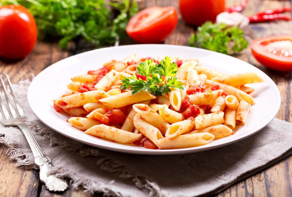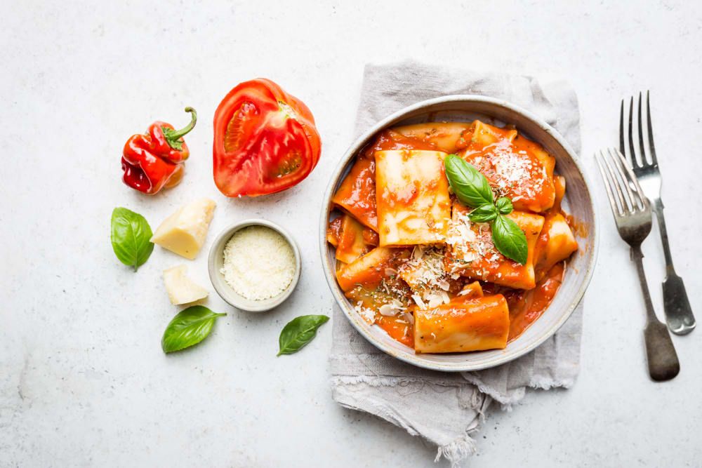 튜브 모양 파스타 면에 가지, 토마토 소스, 리코타 치즈, 바질 페스토를 넣어 볶아낸 메뉴