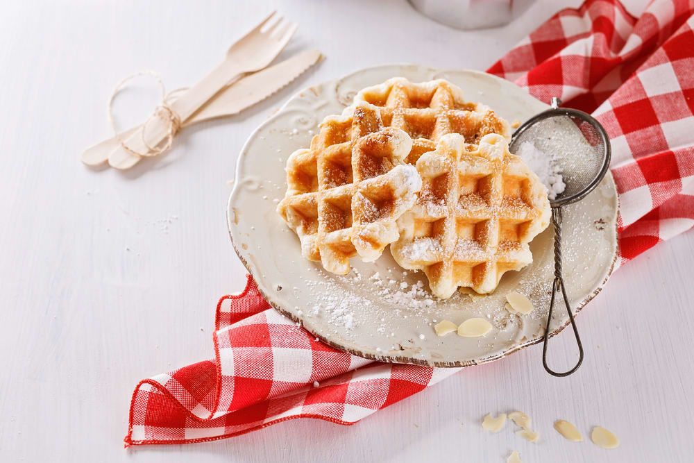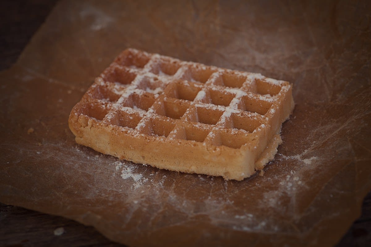 사각형 모양의 와플에 슈가 파우더를 뿌린 메뉴