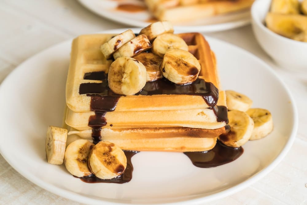 바나나, 초콜릿 시럽을 얹은 와플