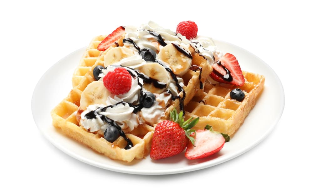 딸기, 바나나, 휘핑크림, 초콜릿 시럽을 얹은 와플