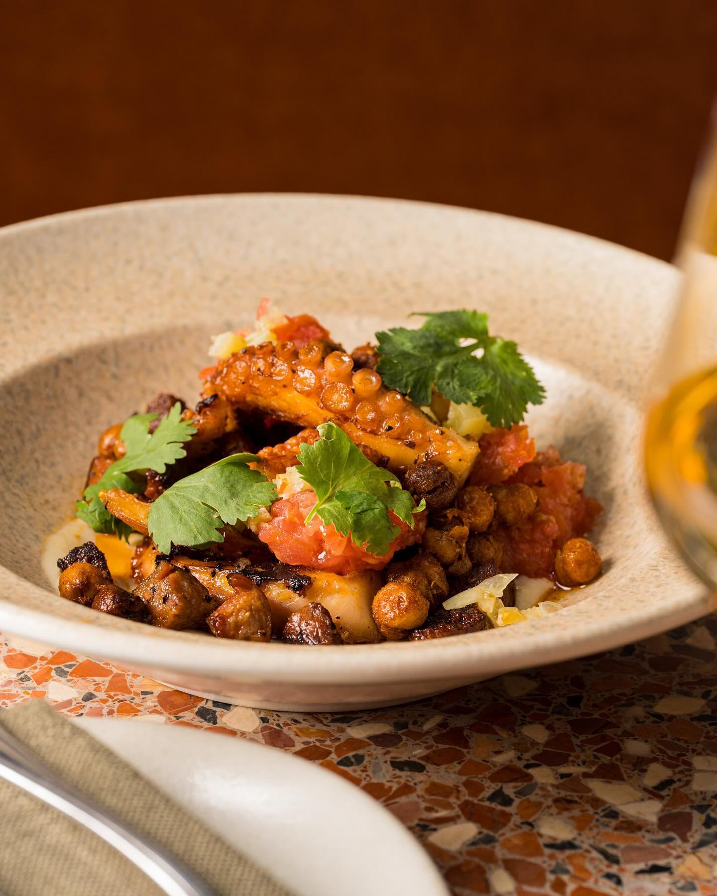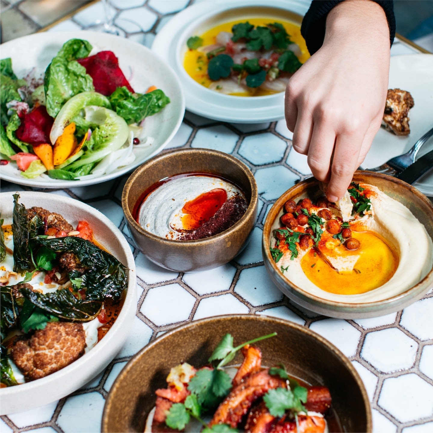 병아리콩을 으깨 만든 후무스에 문어, 토마토 등을 얹은 메뉴