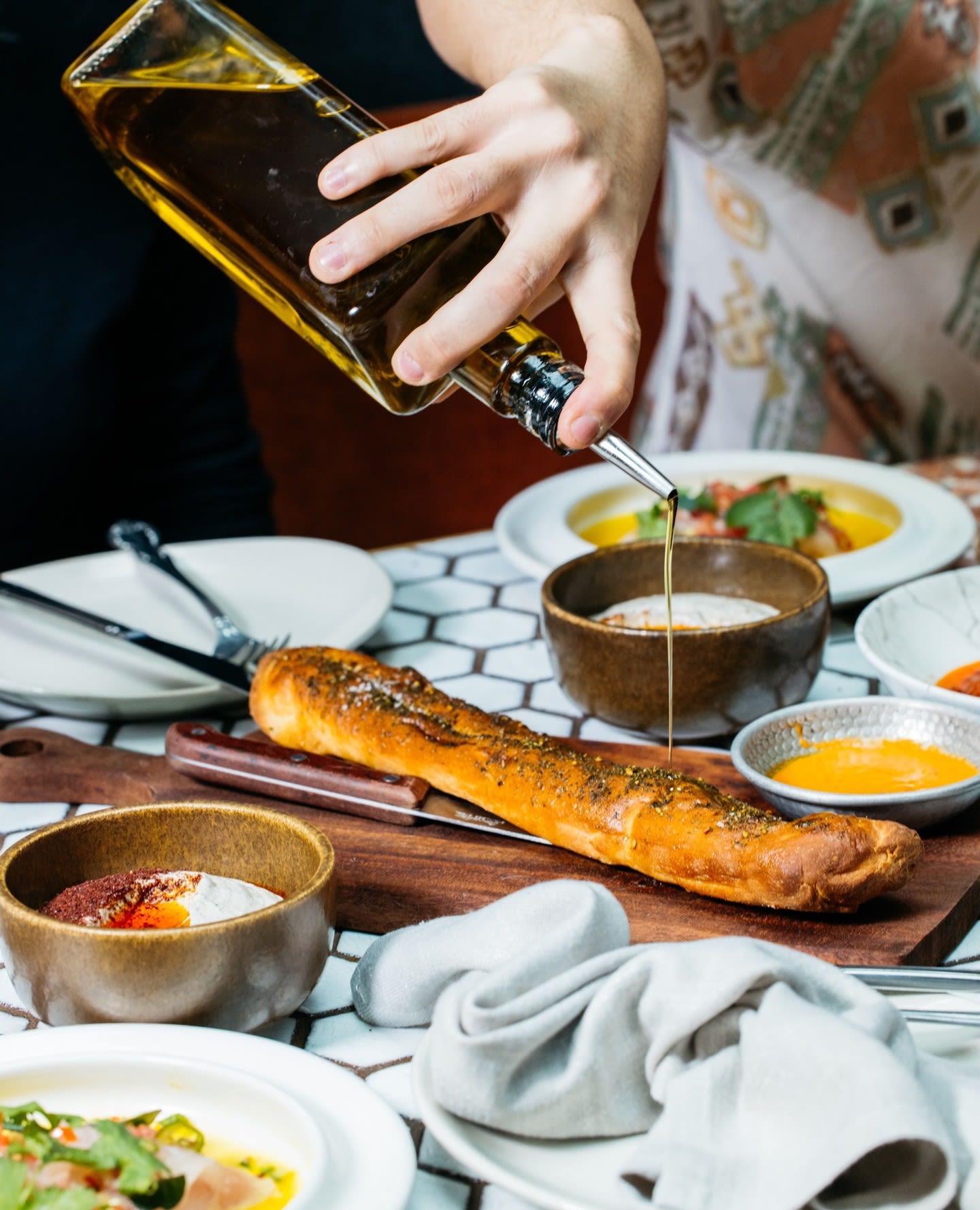 길게 구운 빵에 올리브 오일, 소금 등을 곁들인 메뉴