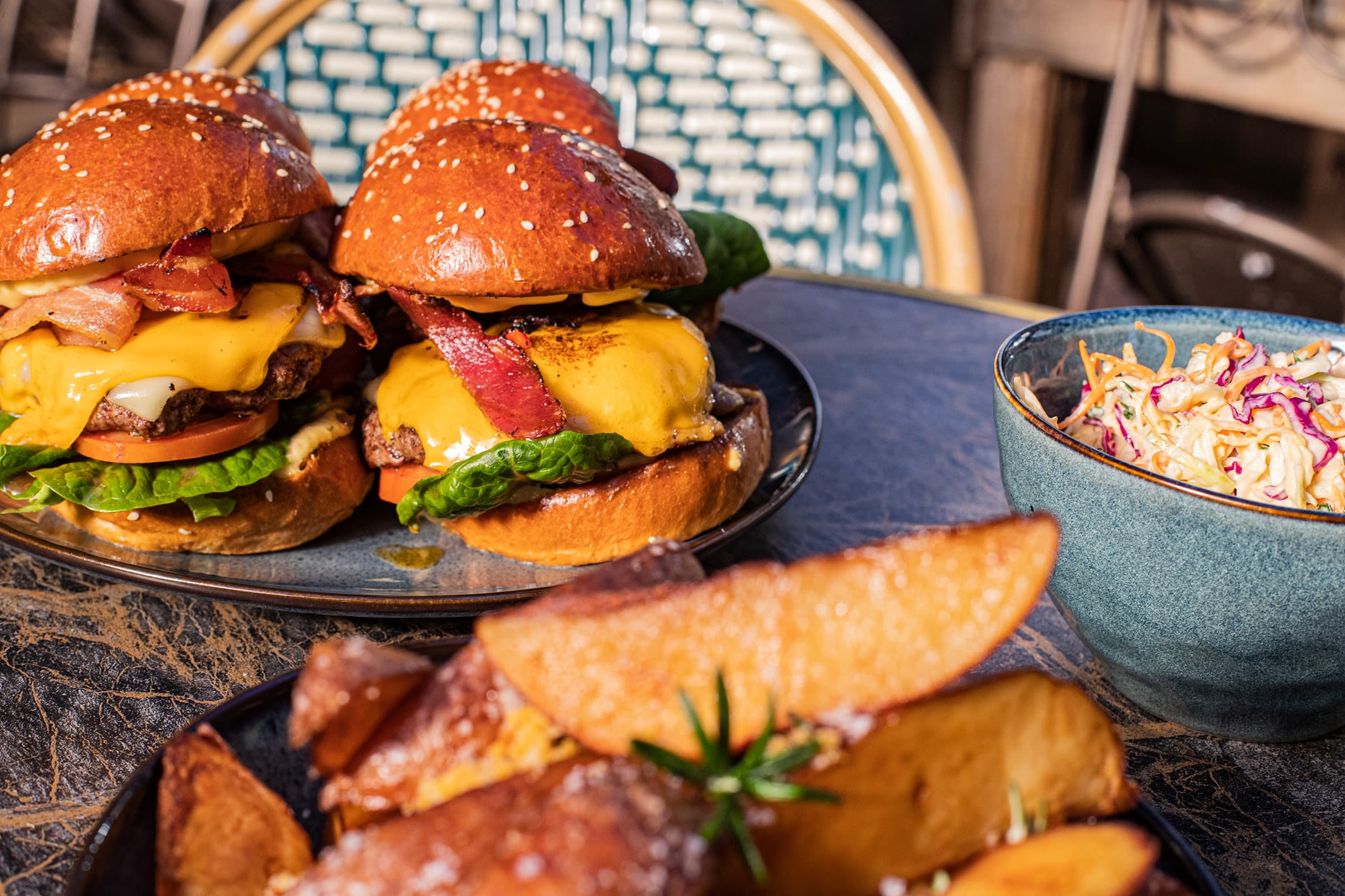 베이컨, 토마토, 달걀프라이 등을 넣은 버거와 감자튀김으로 구성된 메뉴