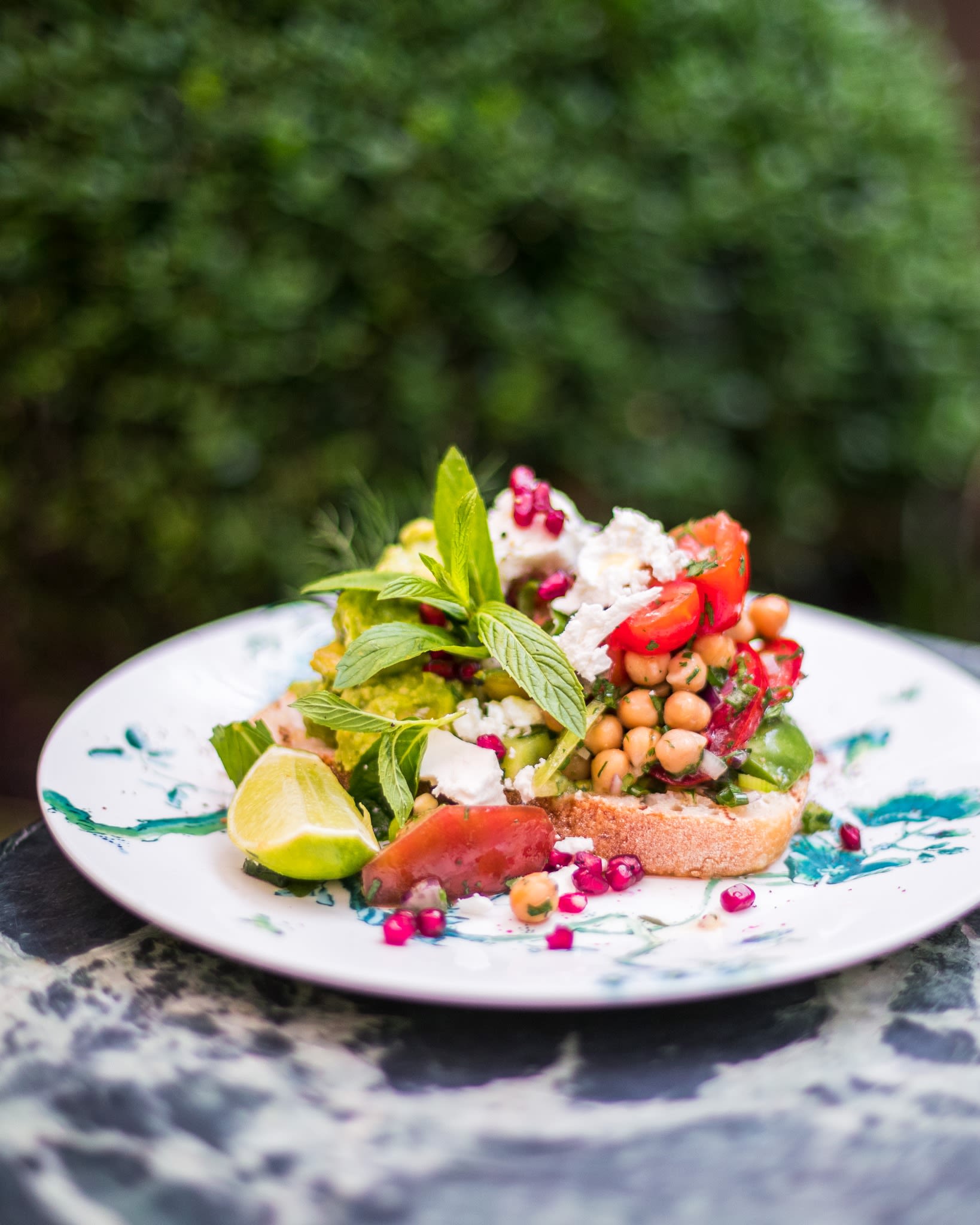 구운 토스트 위에 아보카도, 페타 치즈, 토마토와 무, 레몬 드레싱 등을 올린 메뉴