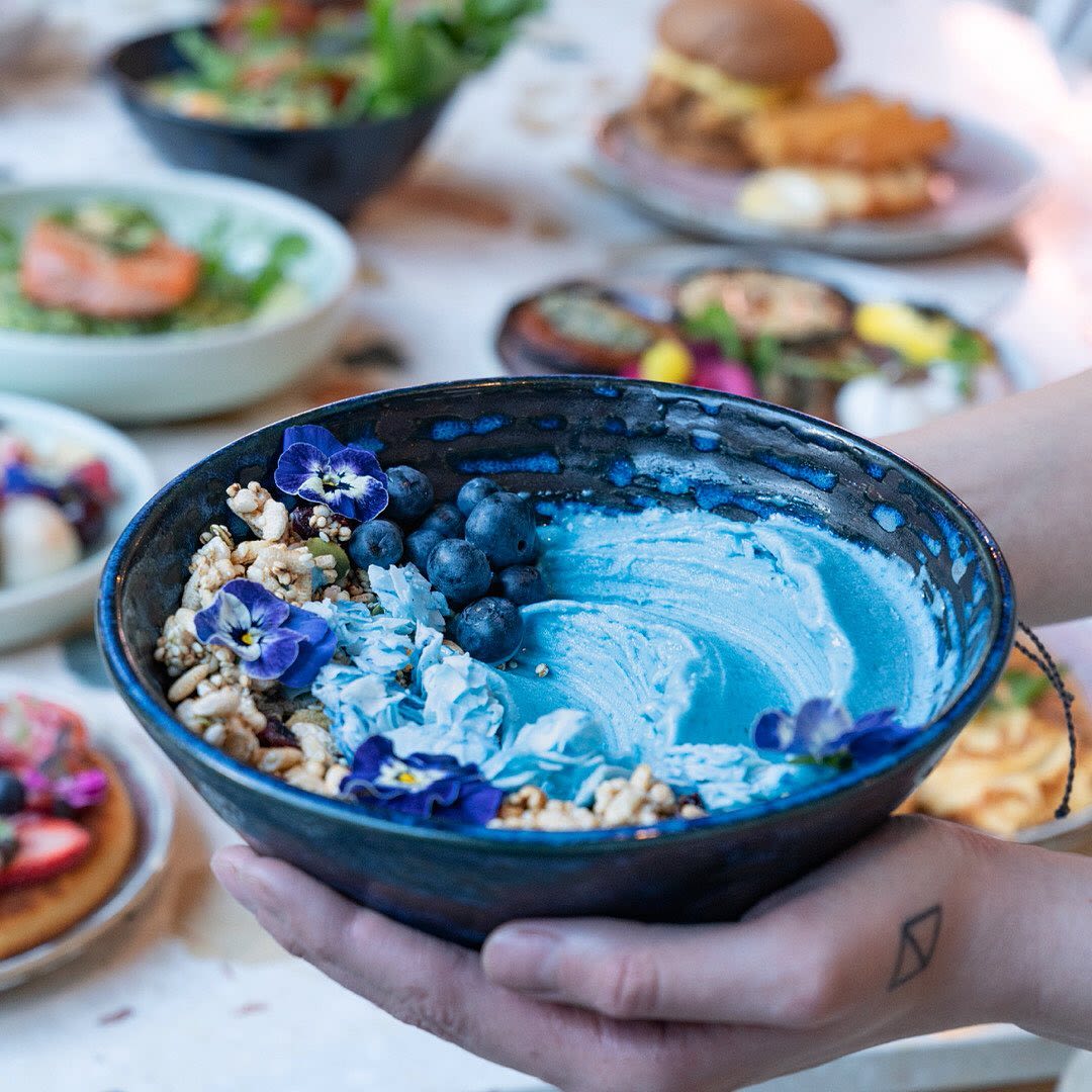 블루 스피루리나, 파인애플, 바나나 등을 넣은 스무디에 그래놀라, 블루베리 등을 얹은 메뉴