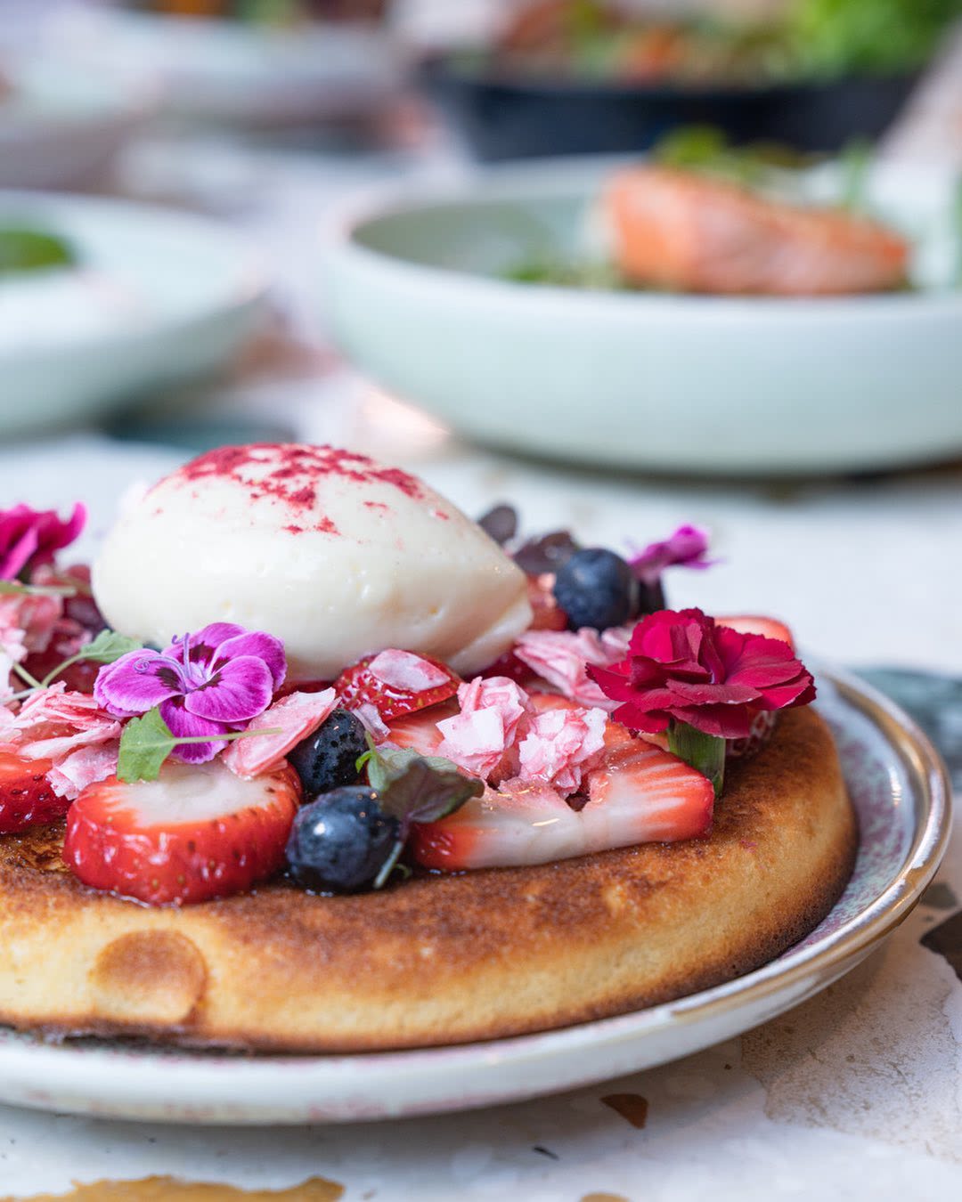 반죽을 구워 계절 과일, 메이플 시럽, 마스카포네 크림 등을 얹은 메뉴