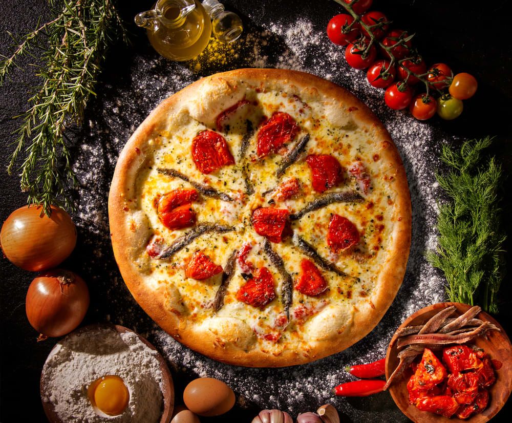 멸치, 토마토, 모차렐라 치즈를 토핑한 피자
