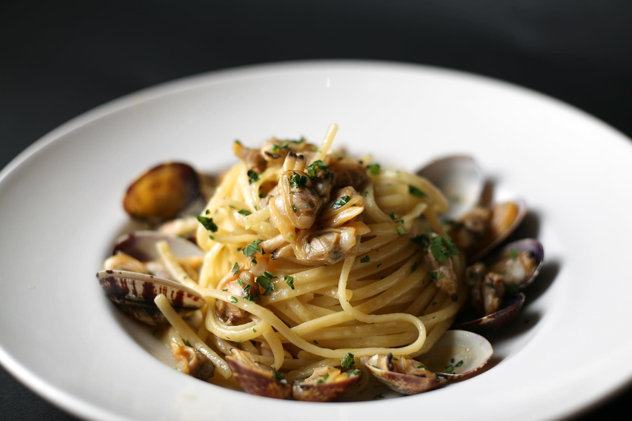 납작한 링귀네 면, 조개, 올리브 오일을 넣고 볶아낸 파스타