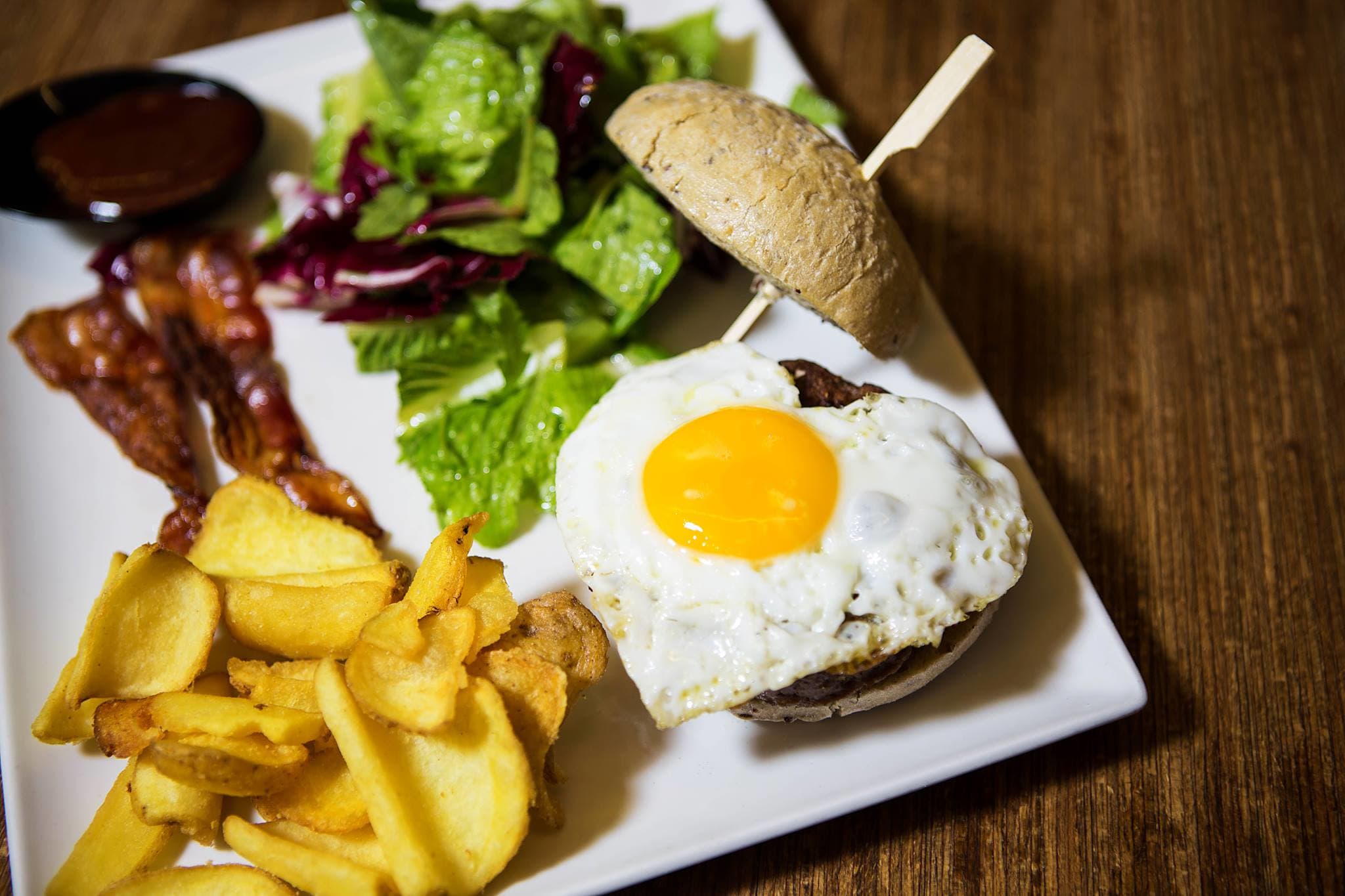 소고기 패티, 달걀 프라이를 넣은 버거에 채소, 베이컨, 감자튀김을 곁들인 메뉴