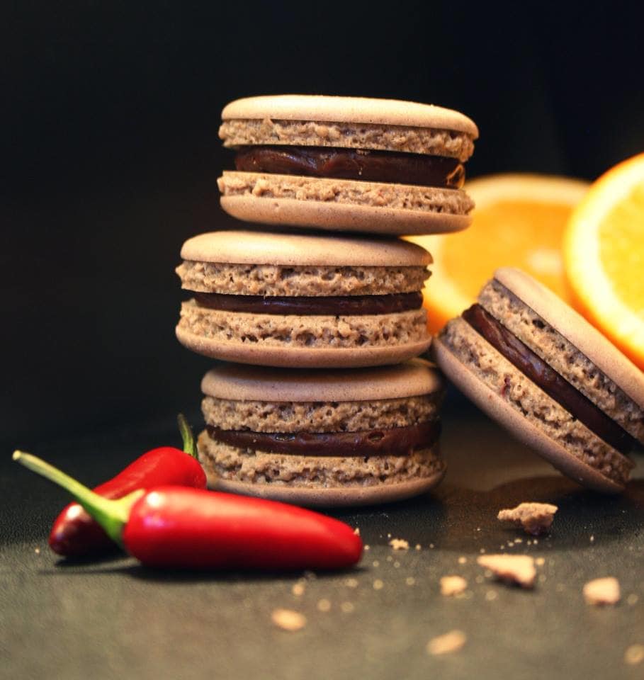 매콤한 향신료와 오렌지맛 초콜릿 필링을 넣은 마카롱