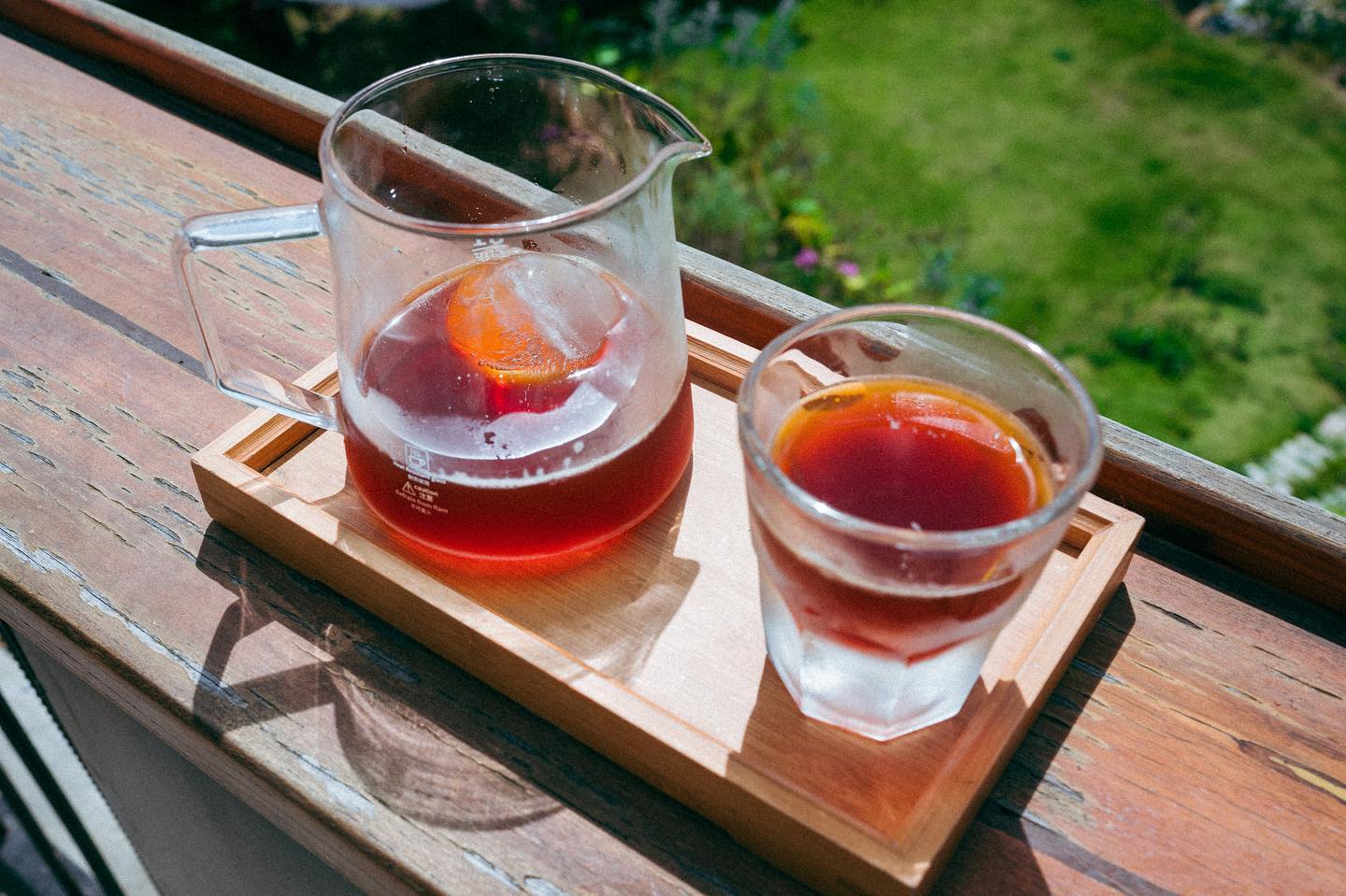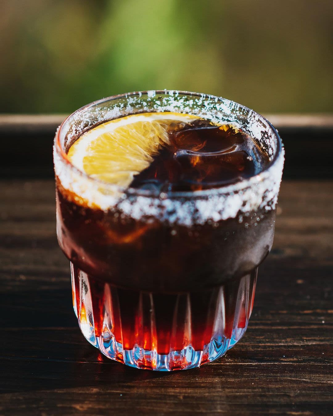 소금을 바른 컵에 차가운 물로 내린 커피와 오렌지 오일을 혼합해 넣은 커피
