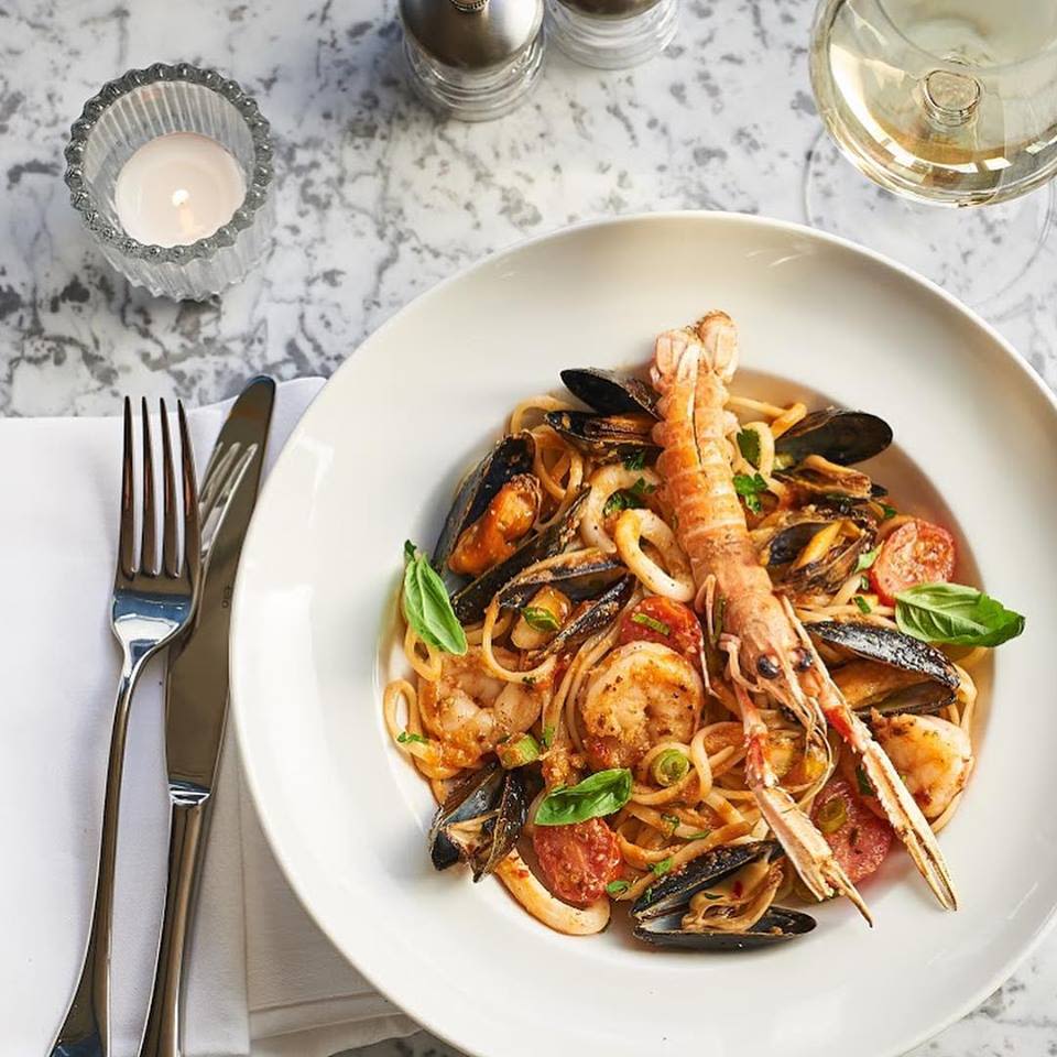 넙적한 링귀네 면에 오징어, 홍합, 새우 등의 해산물을 넣고 볶아낸 파스타