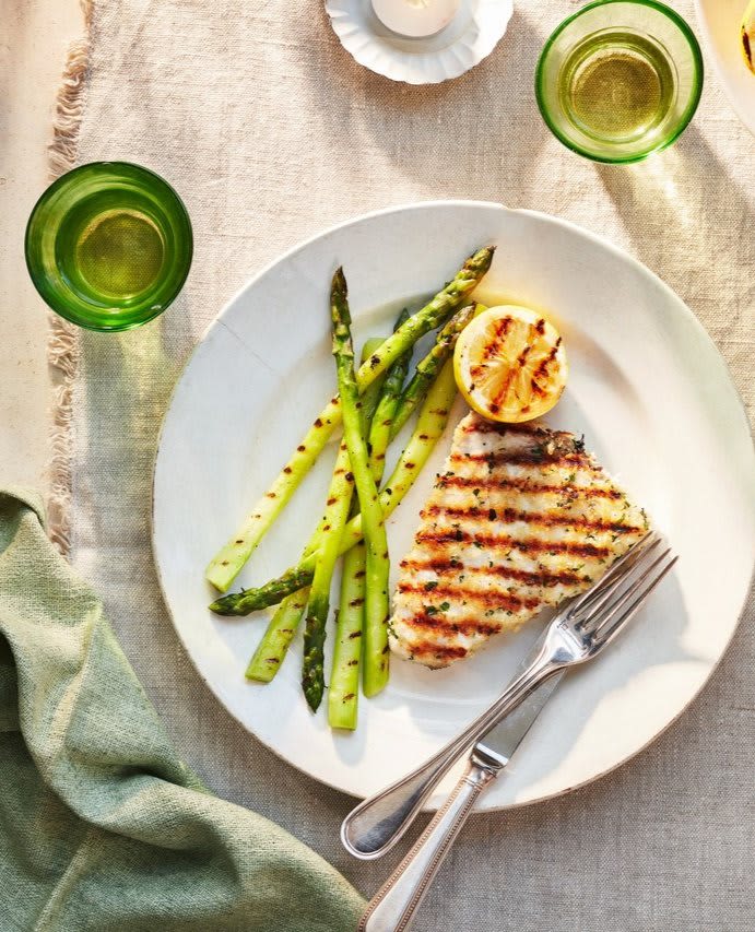 그릴에 구워낸 황새치 스테이크에 아스파라거스, 레몬 등을 곁들인 메뉴