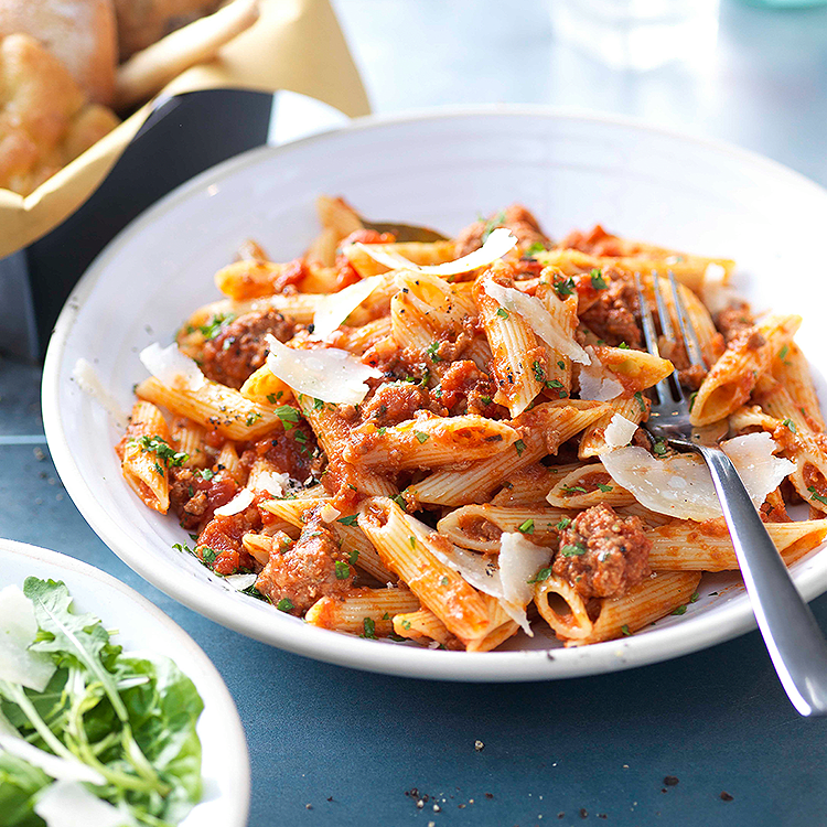 원통형의 펜네 면에 마늘, 칠리, 치즈 등을 넣고 볶아낸 파스타
